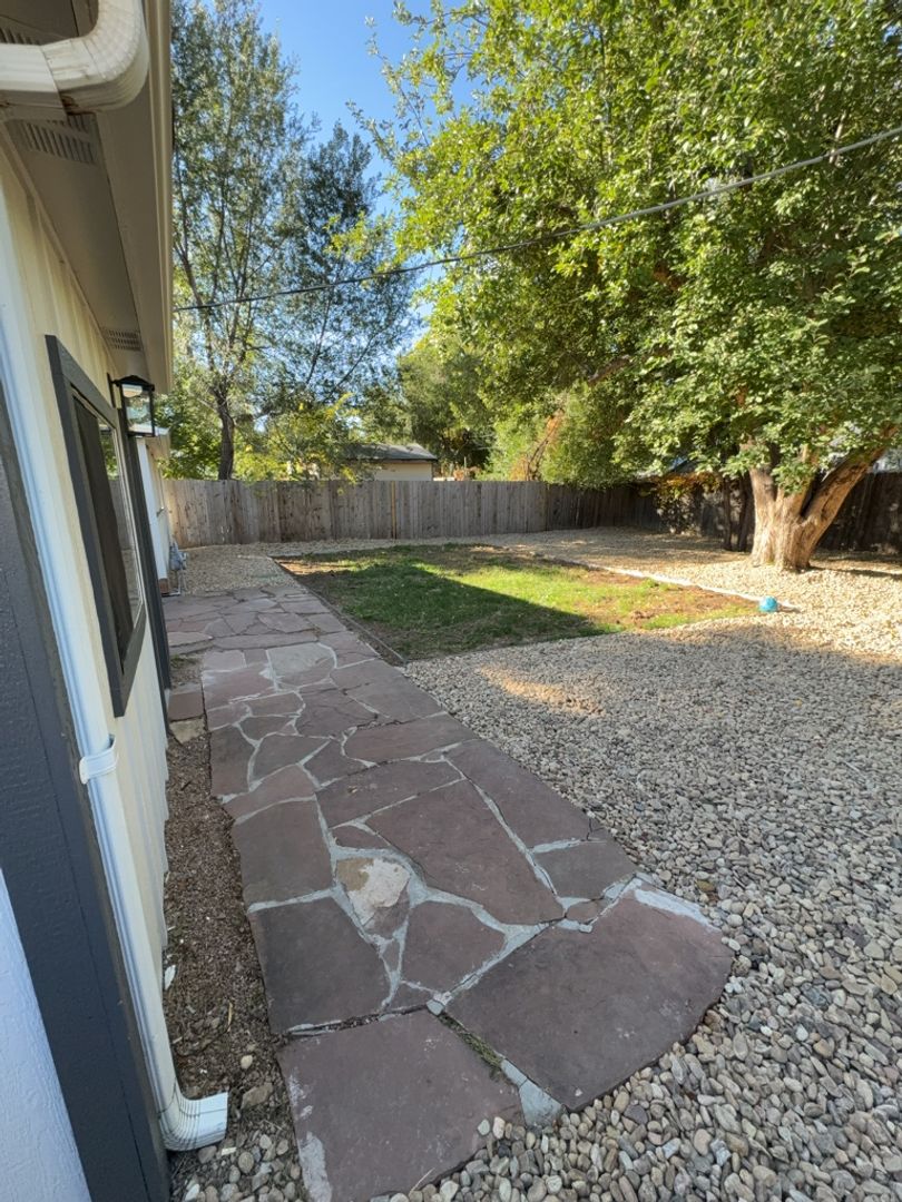 Enjoy outdoor living with a spacious backyard, ample seating, and a covered patio. Inside, the main level includes a bright kitchen, a dining area with a picture window, and two bedrooms with a full bath. A living room is also located off the kitchen with access to the front and back yards.