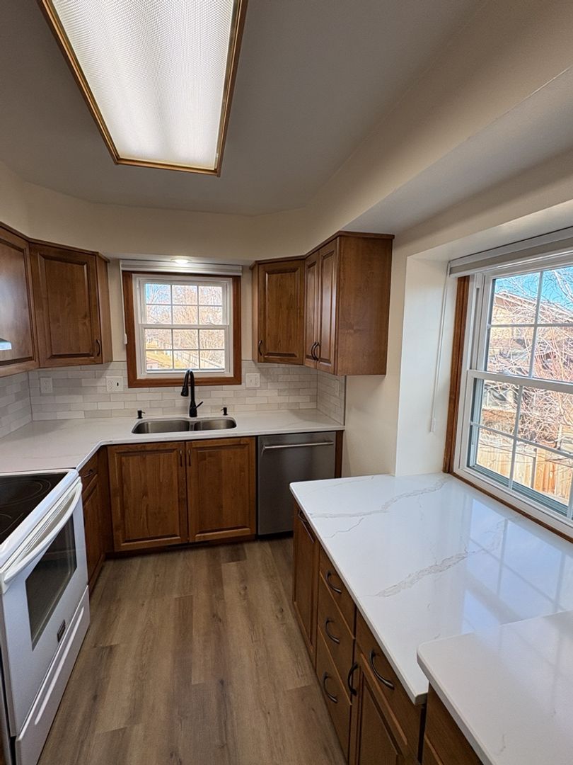Enjoy 2,050 sq ft of beautifully updated living space featuring a garden-level basement and generous room sizes throughout. The kitchen shines with brand-new stone countertops, soft-close cabinetry, and automatic blinds for added convenience. The upstairs bedroom features two closets and a beautifully updated bathroom. The dining and living space upstairs allows for your unique style with its open concept floor plan.